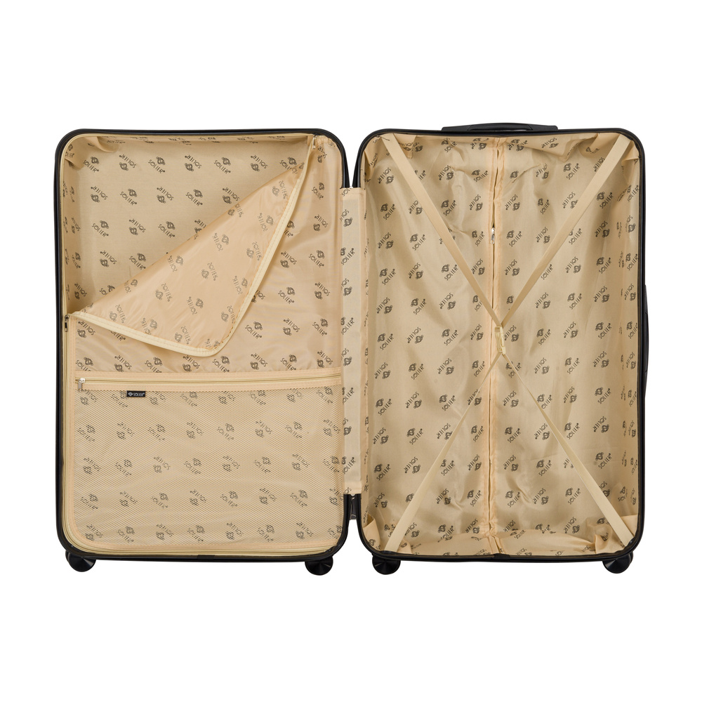 Nowoczesny, elegancki i lekki model wykonany z bardzo wytrzymałego i odpornego na zarysowanie tworzywa ABS Plus. Wyposażony w dwupoziomową teleskopową rączkę oraz zewnętrzne, przyjemne w dotyku gumowe uchwyty. Zabezpieczony zamkiem szyfrowym uniemożliwiającym dostanie się do wnętrza osobom niepożądanym. Posiada trwały, duraluminiowy stelaż wbudowany w walizkę oraz cztery obrotowe kółka, które zapewniają stabilność oraz lekkość i wygodę prowadzenia. Wnętrze wyposażone zostało w wewnętrzne pasy mocujące, zabezpieczające bagaż oraz w sygnowaną i wzmocnioną pianką podszewkę dzieloną zamkiem błyskawicznym na dwie komory.