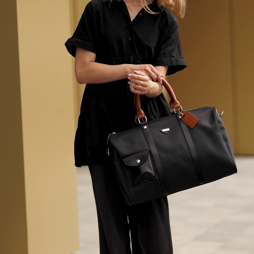 Długie uchwyty pozwalają wygodnie nosić torbę w dłoni lub na ramieniu, a dołączony pasek zwiększa możliwości dopasowania do własnych preferencji. Torba została wykonana z trwałego, odpornego na wilgoć materiału, co czyni ją doskonałym wyborem zarówno na co dzień, jak i w podróży. Sprawdzi się także jako lekki i funkcjonalny bagaż podręczny do samolotu.