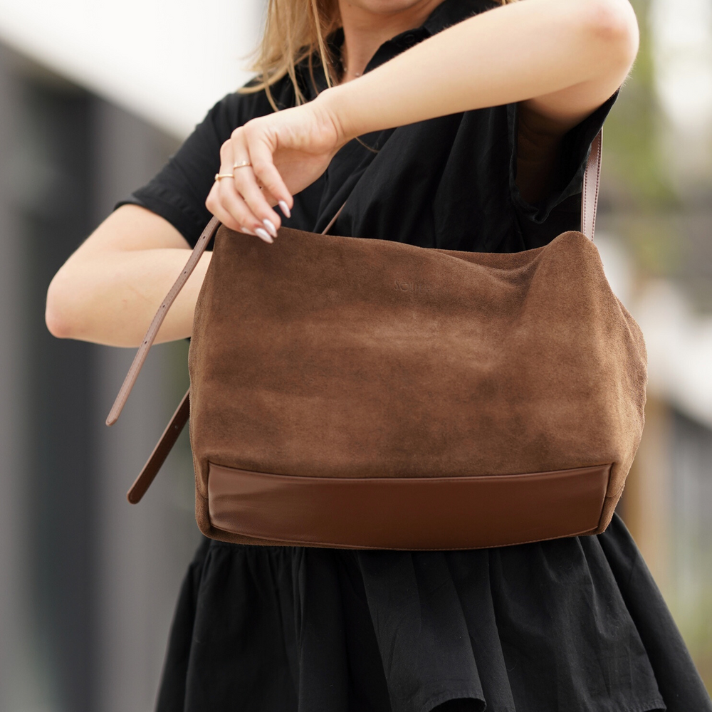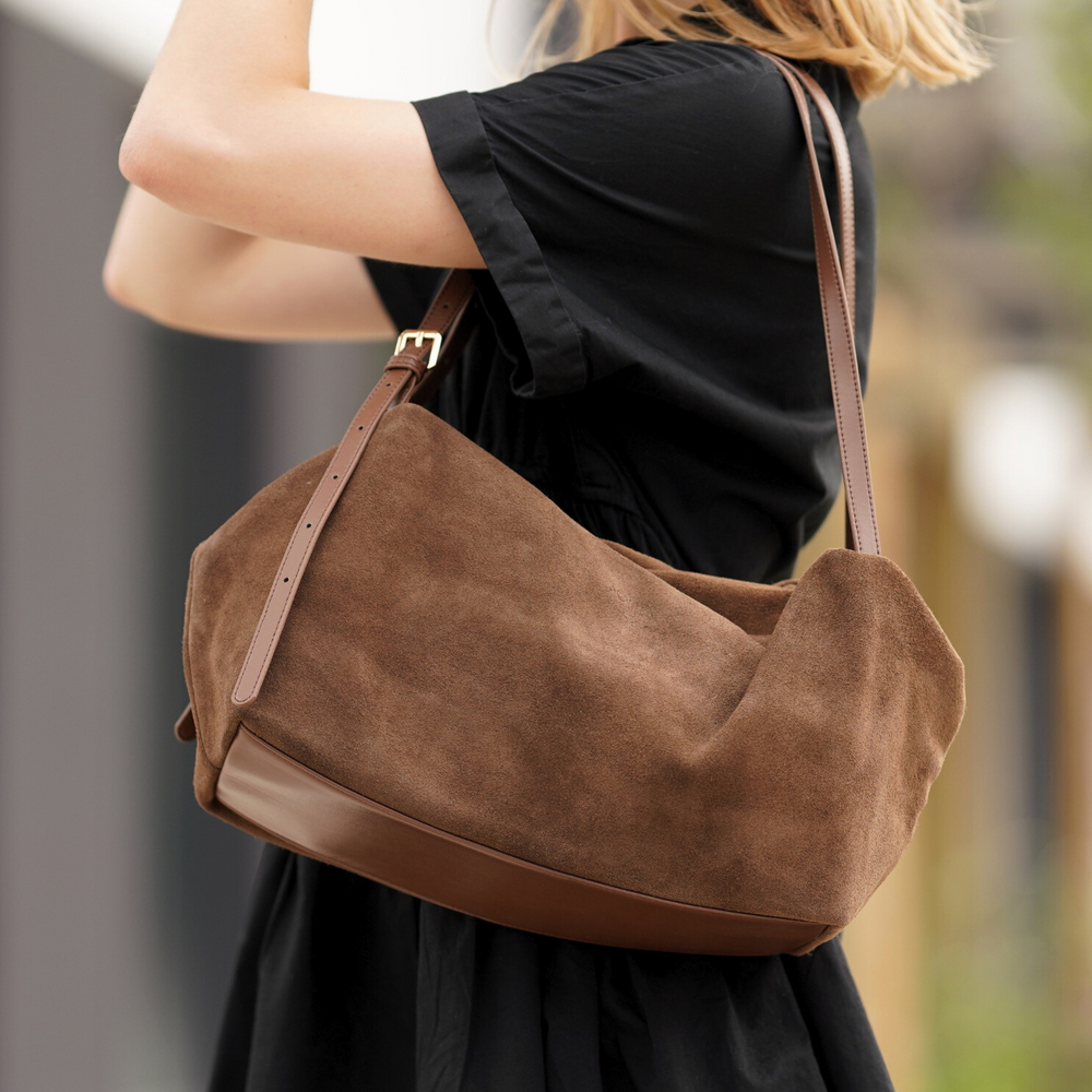Wykonana z wysokiej jakości, naturalnego zamszu, torba prezentuje się niezwykle stylowo i pasuje do każdej stylizacji – od casualowej po bardziej elegancką. Stonowana paleta kolorów nadaje jej uniwersalnego charakteru, dzięki czemu można ją nosić na wiele różnych okazji.